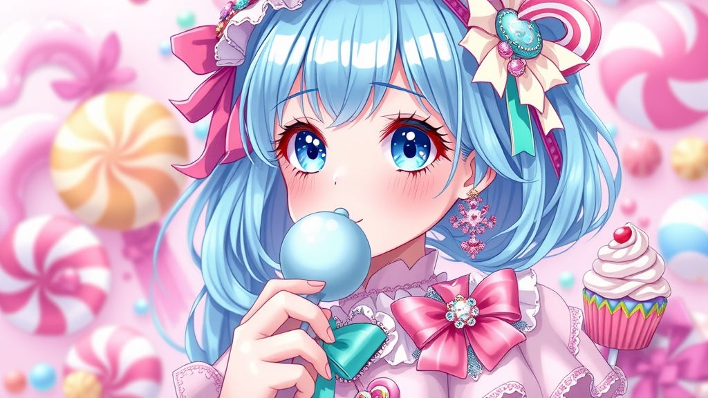 Candy-themed anime girl, solo, super cute, charming expression, petite, cotton candy vibes, candy cane elements, bubble gum accents, vibrant and colorful, whimsical fantasy setting, detailed design, ornate features, ultra-high definition, captivating colors, dreamy planetary and rainbow motifs, sweet cupcake and ribbon decorations, dazzling gem-like shine, imaginative and intricate, single unique girl, creative embellishments, harmonized elements, clear and crisp visuals, complete composition with focus on character, imaginative and cohesive artwork without distortions or text interruptions.