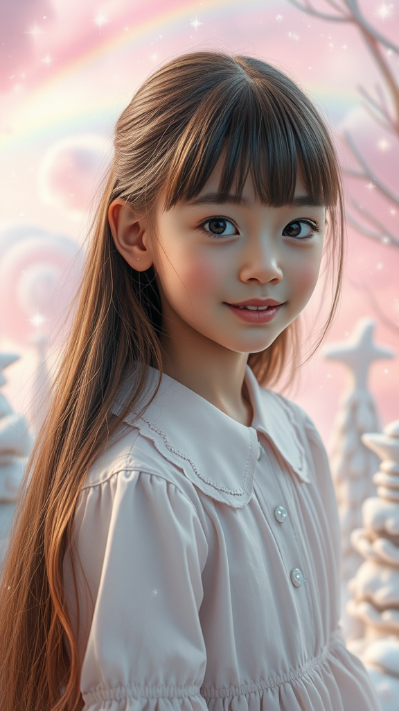Candy wonderland Disney-like ethereal realm with soft, fluffy landscapes and snow-dusted forests. Pastel pink skies blend with greens and blues, sparkled with ethereal light and whimsical rainbows. Stars, diamonds, and gemstone motifs adorn the hyper-realistic, ultra-high-quality cinematic scene, capturing immense detail in full HD. A young girl with long, real-looking skin stands out, sporting blunt bangs and a collared dress, her hair flowing elegantly to the side. The lighting enhances the masterpiece's well-lit, diagonal composition, infusing it with a dreamy, whimsical charm.