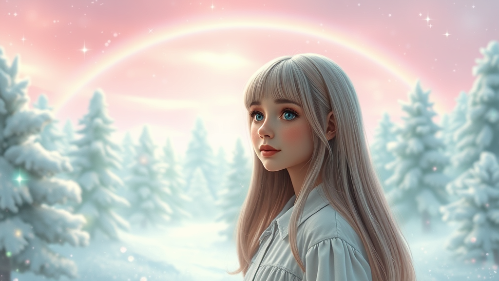 Candy world Disney scenery ethereal, fluffy landscape; a soft, snow-covered forest under a pastel pink sky. Shimmering green and blue hues create a whimsical atmosphere, illuminated by ethereal light. A light rainbow arcs across, with twinkling stars and diamonds casting glimmers over the scene. Sparkling gemstones add to the magical background, painted in hyper-realistic detail with ultra-cinematic lighting. A girl with well-lit, diagonal bangs and long hair stands out, wearing a collared dress. Her skin appears realistic, embodying a masterpiece in this best quality, fully detailed HD painting.