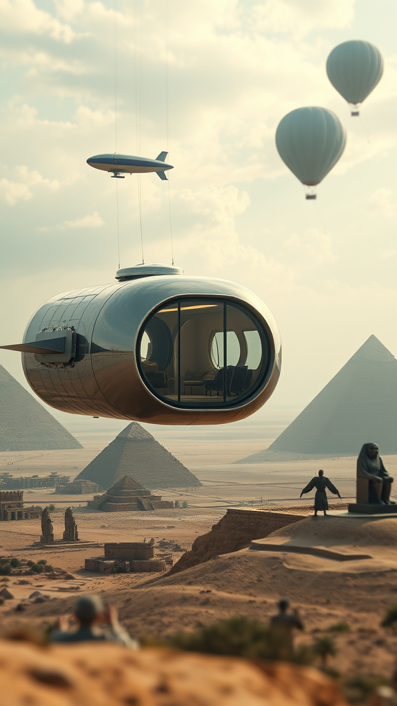 Capsule house suspended in mid-air above the landscape, featuring an epic front door and expansive glass windows; artstation level detail with cinematic realism, inspired by fenghua zhong, presenting a blurry and dreamlike quality; elements of surrealism with extra arms and fingers, wings, and shadowy figures; juxtaposed with ancient Egyptian pyramids and statues in the background; a whimsical touch with two floating balloons and a blimp in the sky, creating a sense of fantastical mutation and intrigue.