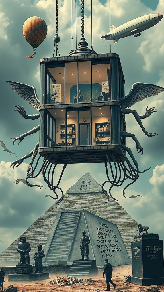 Capsule house suspended in mid-air, featuring a grand entrance with large glass windows, artstation, highly detailed, cinematic, realistic, intricate, inspired by fenghua zhong, vague and dreamlike with extra limbs and fingers, hands abstractly drawn, surreal and mutated forms, adorned with wings, casting shadows over an Egyptian pyramid and statues, displaying cryptic text, accompanied by two balloons and a hovering blimp.