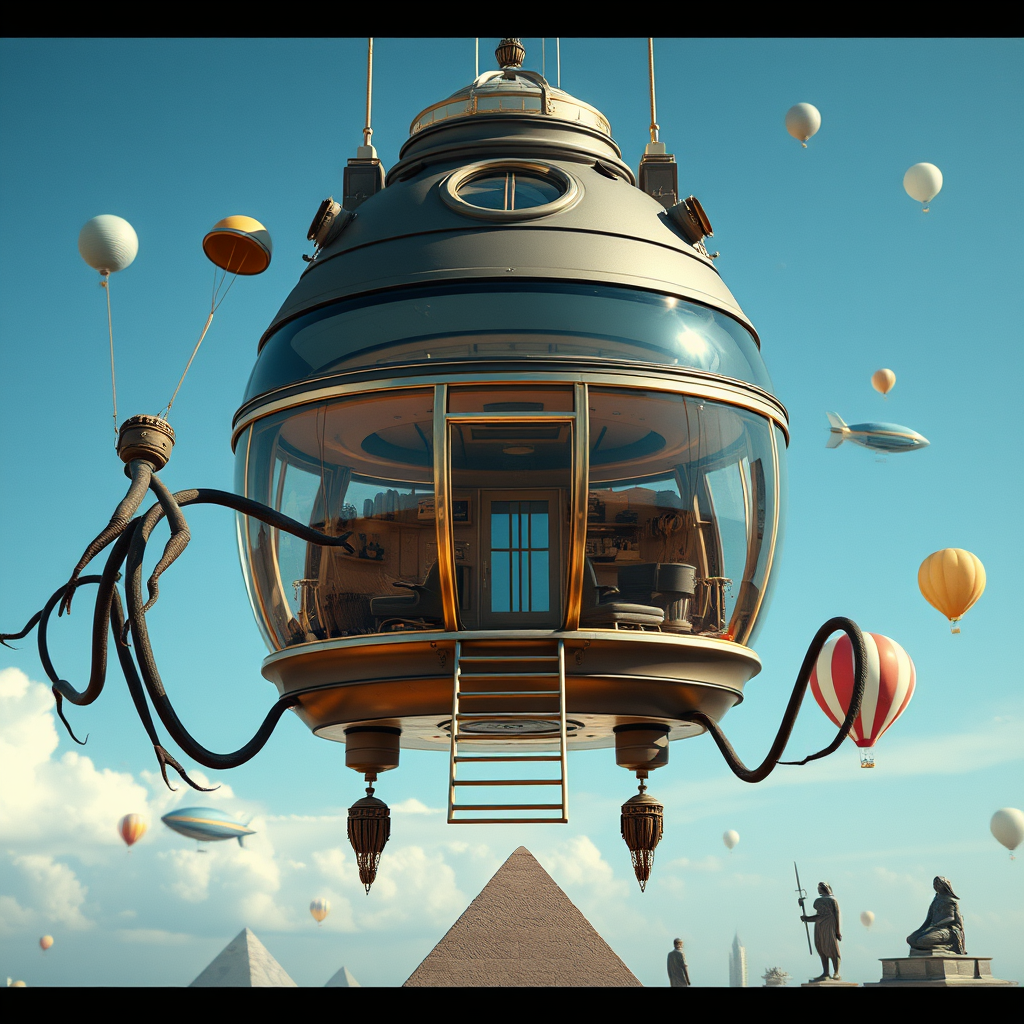Capsule house suspended in mid-air, featuring an epic front door and expansive glass windows, artstation style with high detail, cinematic and realistically epic, inspired by Fenghua Zhong. Blurred and surreal elements with extra limbs and distorted features, reminiscent of shadowy Egyptian pyramids and statues. Accompanied by whimsical features like balloons and blimps, creating a fantastical yet slightly disfigured scene.