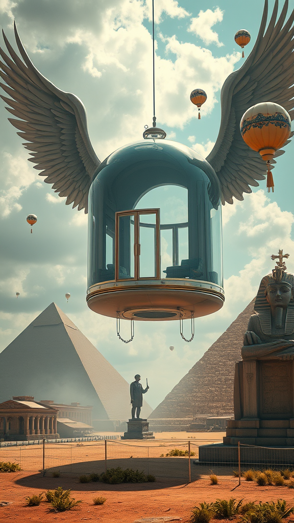 Capsule house suspended in the air above ground, featuring an epic front door and large glass windows, high detail and cinematic realism, inspired by the style of Fenghua Zhong on ArtStation, with an intriguing blend of elements like wings and shadow play, juxtaposed against an Egyptian pyramid and statue, creating a surreal atmosphere, incorporating imaginative extra elements such as balloons and blimps, maintaining a focus on detailed textures and a dreamlike, slightly disfigured composition.