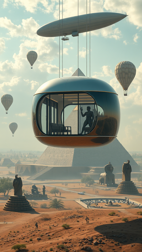 Capsule house suspended in the air above the ground, featuring a grand entrance and expansive glass windows, artstation quality with high detail and cinematic realism, inspired by Fenghua Zhong. The scene includes dreamy, ethereal elements with blurred lines and soft focus. Surreal features include oddly intriguing shapes, multiple limbs, and distorted forms. The backdrop showcases a majestic Egyptian pyramid alongside ancient statues, two floating balloons, and a massive blimp casting shadows across the landscape.