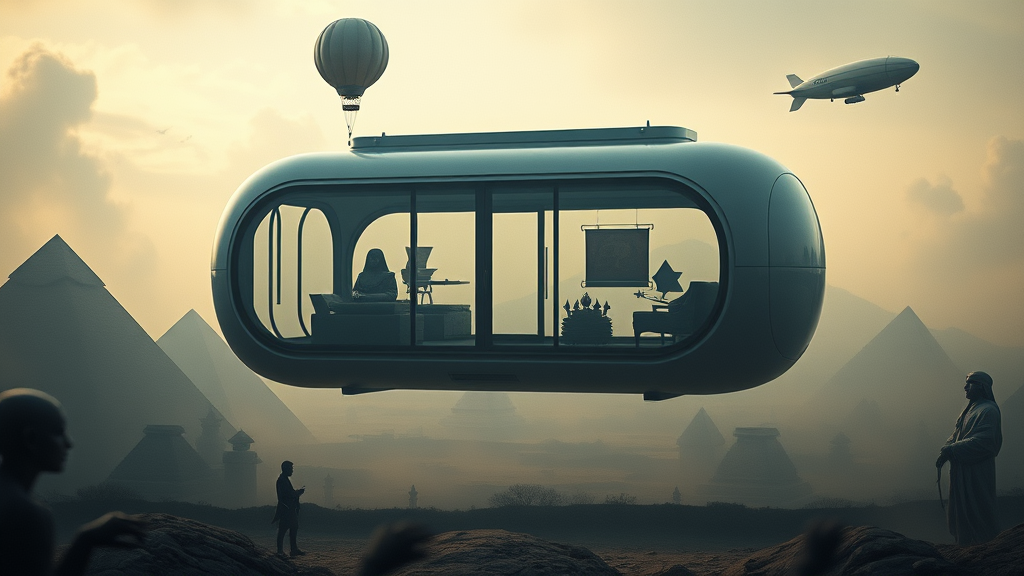 Capsule house suspended in the air, levitating above the ground with an epic front door and expansive glass windows, artstation-inspired, high detail, cinematic with realistic depth, detailed in a style reminiscent of Fenghua Zhong. Surreal elements include shadows forming Egyptian pyramids, mysterious statues, and blurred, fuzzy outlines that suggest extra appendages. The scene is dotted with two balloons and a floating blimp, creating an enigmatic atmosphere where reality blurs into imagination.