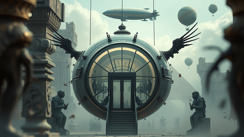 Capsule house suspended in the air, majestic front door with expansive glass windows, artstation style, highly detailed, cinematic, epic realism, inspired by fenghua zhong, ethereal atmosphere, blurred surroundings, abstract elements with extra limbs and fingers, distorted features, intricate yet deformed structures, mutated forms with wings casting shadows, ancient Egyptian pyramid influence, enigmatic statues, scattered text, dual floating balloons, hovering blimp in the background.