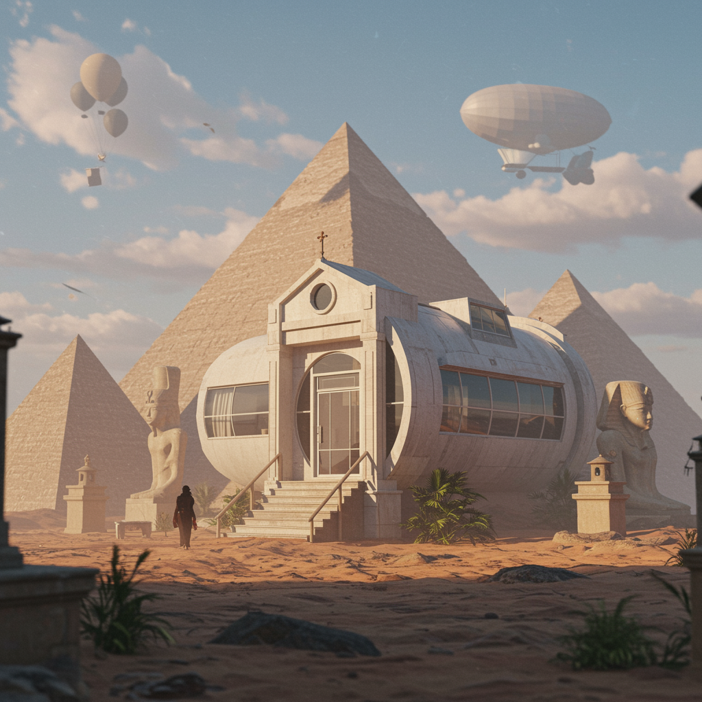 Capsule house suspended in the air with a majestic front door and expansive glass windows, artstation style with high detail and cinematic realism; inspired by fenghua zhong. Blurry and ethereal atmosphere with hints of extra limbs and surreal elements; shadows cast from an Egyptian pyramid and statues nearby; subtle hints of balloons and a distant blimp in the sky, creating a dreamlike fusion of structures and forms.