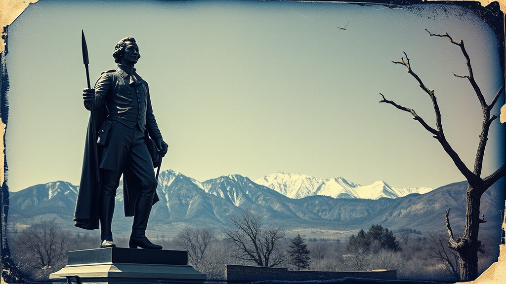 captain george washington statue from classic sun valley landscape collection by w, in the style of vintage cyanotype prints, 20k uhd, weathered leather and crimson, neo-tintypes, dry plate positives, witty social critique, subtle texture --ar 157:233 --quality 3 --s 800