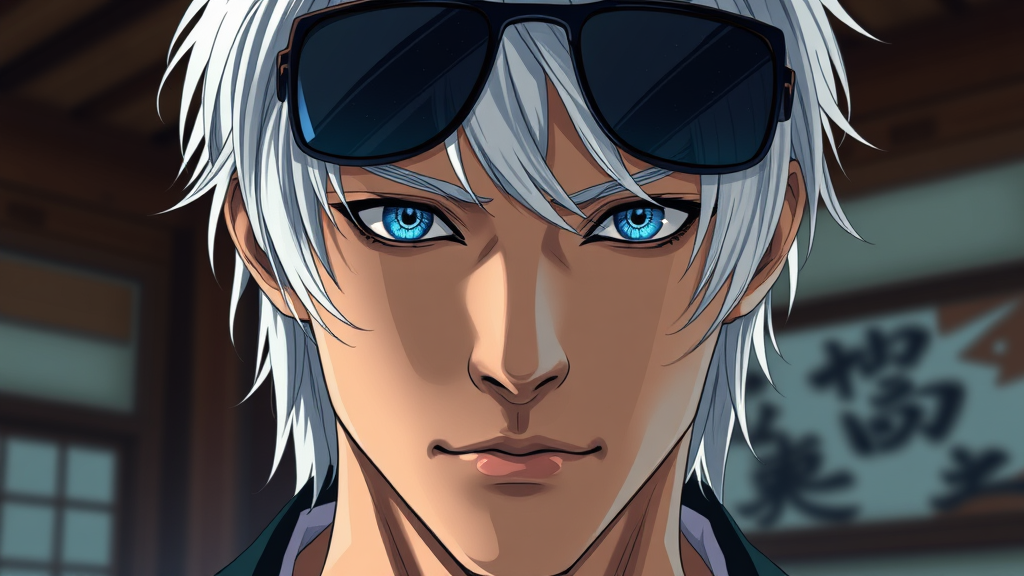 Captivating character inspired by Satoru Gojo from Jujutsu Kaisen, featuring a strikingly handsome man with medium-length white hair and sunglasses casually perched on the bridge of his nose, partially revealing mesmerizing deep blue eyes reminiscent of a swirling galaxy. His gaze is direct and engaging, drawing viewers in. The atmosphere is hyper-realistic, rich in details, and captured in exquisite 8k resolution, enhancing the overall visual experience with subtle creative embellishments that maintain the essence of the original concept.