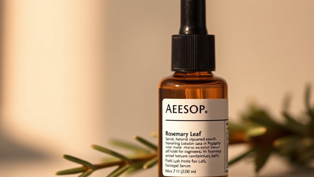 Captivating close-up shot of Aesop's Rosemary Leaf Anti-Oxidant Serum, captured with a Nikon Z7 II, highlighting the serum's sophisticated glass bottle and naturally-inspired aesthetic, bathed in a gentle, golden glow for a serene ambiance.