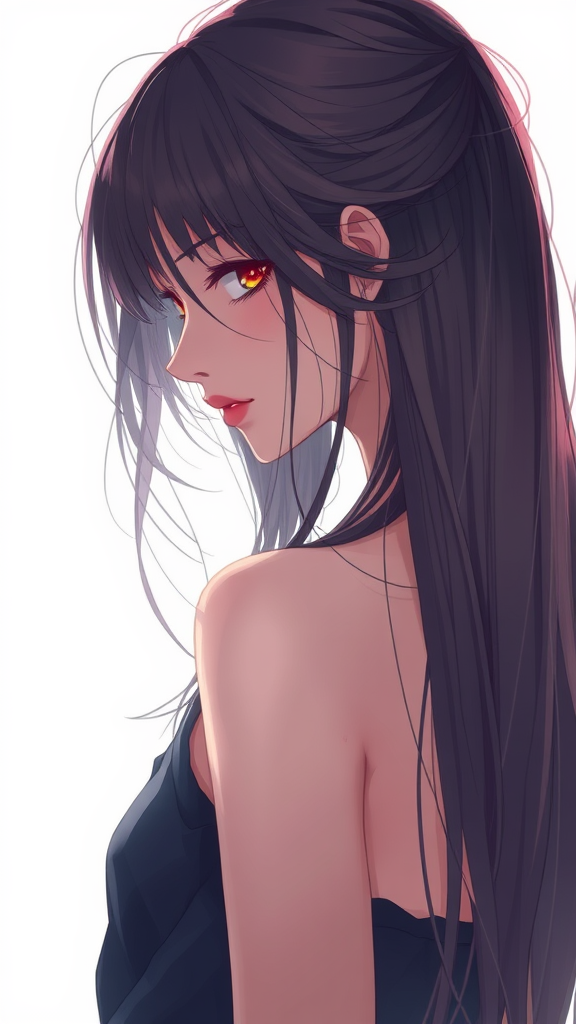 Captivating digital illustration of a 20-year-old woman facing away from the camera, her long hair cascading down her back, exuding a mysterious yet charming allure. The image uses natural colors and ultra-detailed 4k quality to create a mesmerizing and intricate artwork. Inspired by niji, comics, and anime styles, the illustration captures her sultry expression, focusing on elegance and grace. Avoids low quality, graininess, and poorly drawn elements, maintaining proper anatomy and proportions while ensuring the image is clean and free of text, signatures, or artifacts, resulting in an unforgettable visual masterpiece.