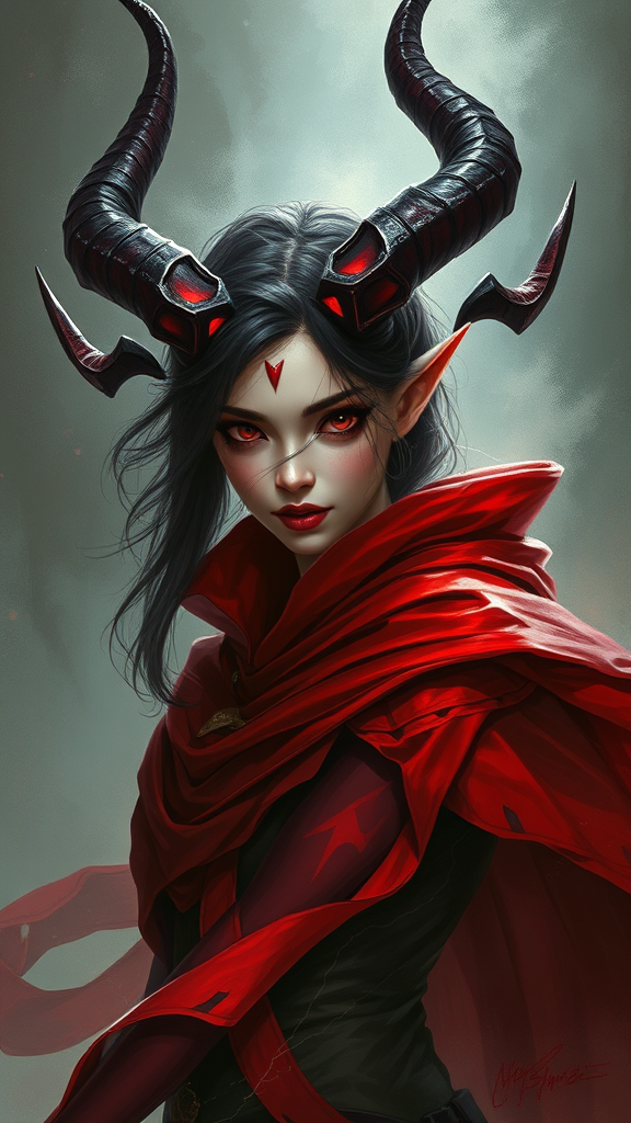 Captivating digital illustration of a mesmerizing tiefling female warlock featuring intricate horns and a flowing crimson cape, dark fantasy aesthetic influences, echoing the styles of Alena Aenami and Artgerm, with a touch of Mohrbacher's and Guillem H. Pongiluppi's artistry, a portrait that captures a haunting yet alluring demon girl, her enchanting gaze and mystic aura complemented by an ethereal backdrop, DnD character inspiration manifesting powerful elegance and otherworldly beauty.