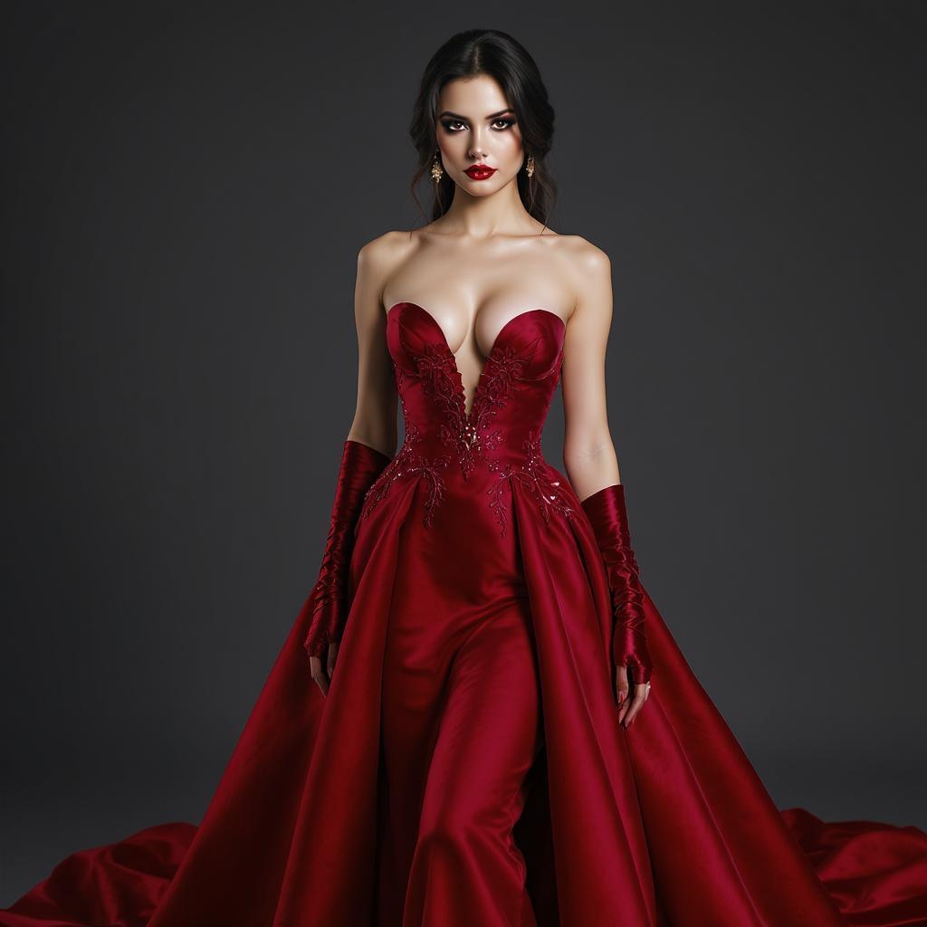 Captivating Eastern European model in an elegant crimson gown, intense atmosphere, hyper-realistic, premium clarity, high-fashion aesthetic, studio illumination, RTX-enhanced, captured with a 70mm lens, 16-megapixel resolution, 8K detail --quality.