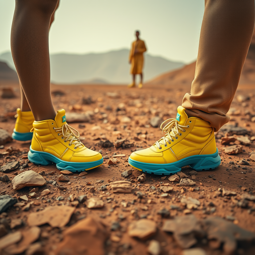 Captivating fashion photography on the rugged terrain of Mars, featuring models wearing striking yellow and azure shoes. The scene captures the vibrant contrast against the Martian backdrop, showcasing a luxury brand in exquisite high resolution. The photorealistic detail emphasizes the 8k clarity, highlighting the bold design and innovative style of the footwear in a cosmic setting. This compelling image encapsulates an interplanetary fashion statement.