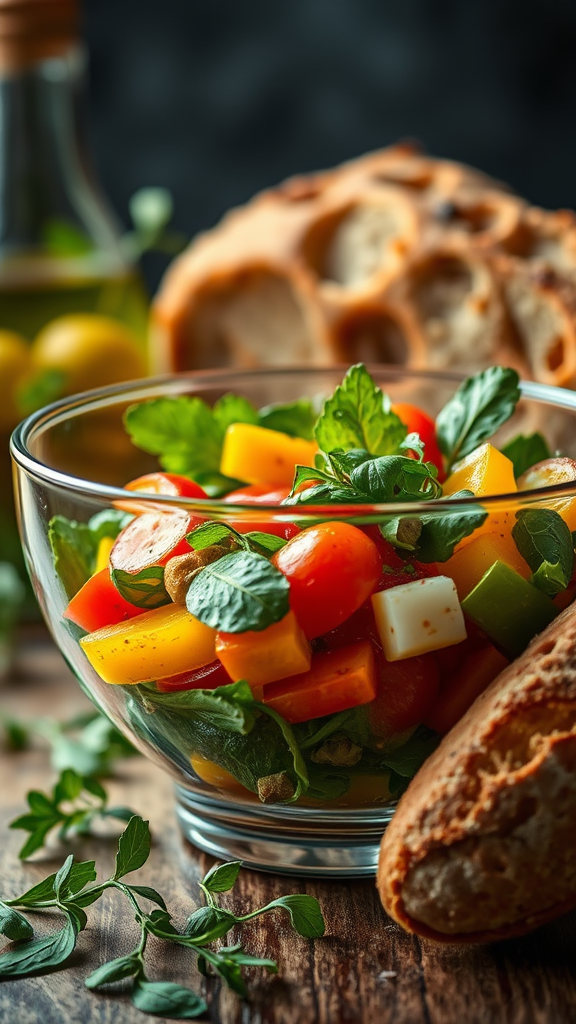 Captivating food photography showcasing a vibrant vegetable salad in a crystal-clear glass bowl, drizzled with premium olive oil. Accompanied by rustic artisanal bread, the scene emanates a sense of luxury akin to a Michelin-starred kitchen. Shot in studio lighting with a remarkable depth of field, every detail is ultra-defined. Soft uplighting accentuates the natural textures, captured in a stunning close-up that highlights the freshness and allure of the ingredients.
