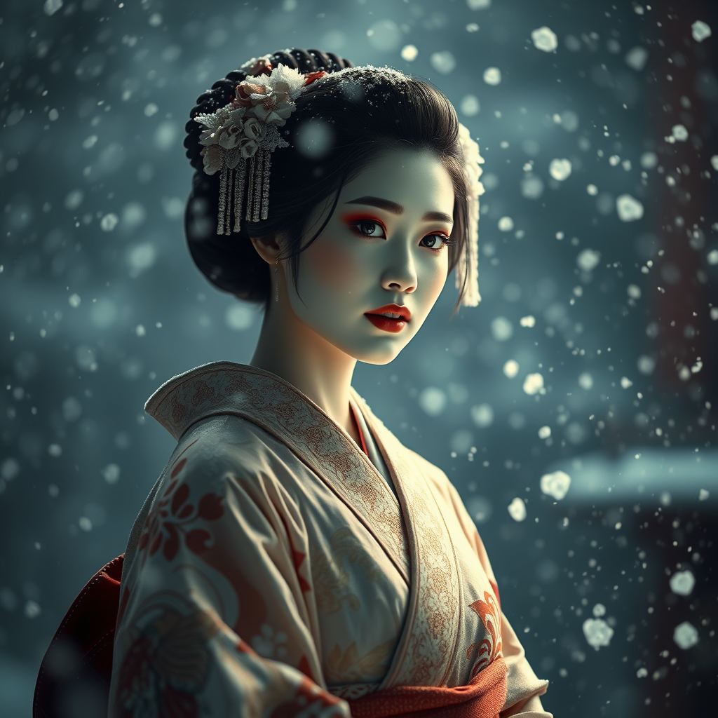 Captivating Geisha standing gracefully amidst a serene snowfall, her milky white skin glowing softly under the intricate patterns of her kimono. The scene is exquisitely detailed with an elegant touch, channeling the artistic styles of Tom Bagshaw and Seb McKinnon. Her expression, hyper-realistic and photorealistic, captures a moment of cinematic grandeur, enhanced by dramatic and volumetric lighting that creates depth. Shot with the clarity of a Hasselblad H3DII lens, the image possesses ultra detail, making each snowflake and fabric thread discernible. The atmosphere is ethereal, almost dreamlike, with a subtle denoise effect that adds to the tranquil ambiance.
