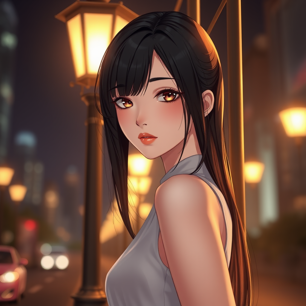 Captivating girl face, sleek long black hair, tall and slender silhouette, standing gracefully by a lamppost, intricately detailed, Anime-inspired elegance, Glamorous Shot, Stunning Lighting, rendered with octane finesse, exuding elegance, impeccably detailed, hyper-realistic charm, cinematic flair, striking dramatic lighting, ethereal volumetric effects, captured through a 150mm lens, photorealistic quality, with a touch of dreamlike denoise, Artstation quality, avoiding any anatomical distortions or imperfections, beautifully in-frame, singular and unique expression.