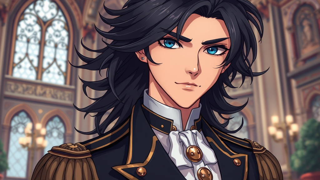 Captivating illustration of a distinguished young gentleman, dark flowing hair, deep ebony eyes, aristocratic allure, dressed in an elegant uniform, strikingly handsome, impeccably stylish, age 22, exceptional quality, a true masterpiece, intricate details, vibrant elements, animated feel, set against the backdrop of a grand mansion, ultra-high definition, HDR, subtle dreamlike ambiance, imaginative flair.