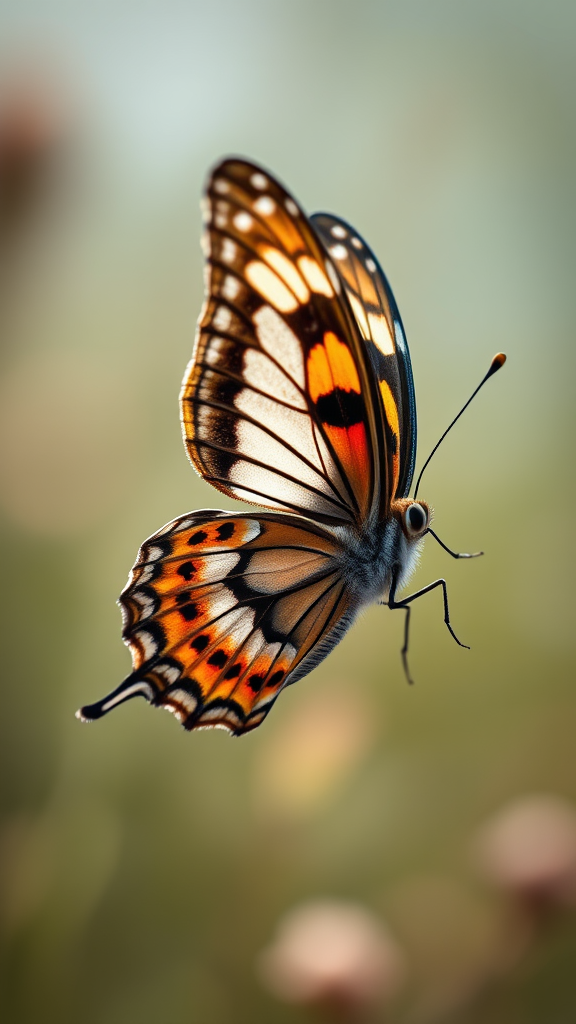 Captivating image of a butterfly caught mid-flight, showcasing an ultra-realistic and intricately detailed close-up, reminiscent of a National Geographic photograph. Wings displaying vivid patterns and colors, set against a softly blurred natural background, capturing the elegance and delicate beauty of the moment.
