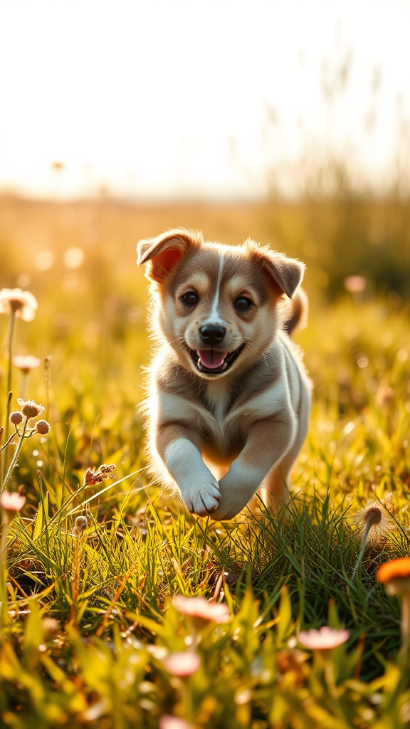 captivating image of a playful puppy frolicking in a sunlit meadow, with wildflowers in the background and the gentle breeze ruffling its fur