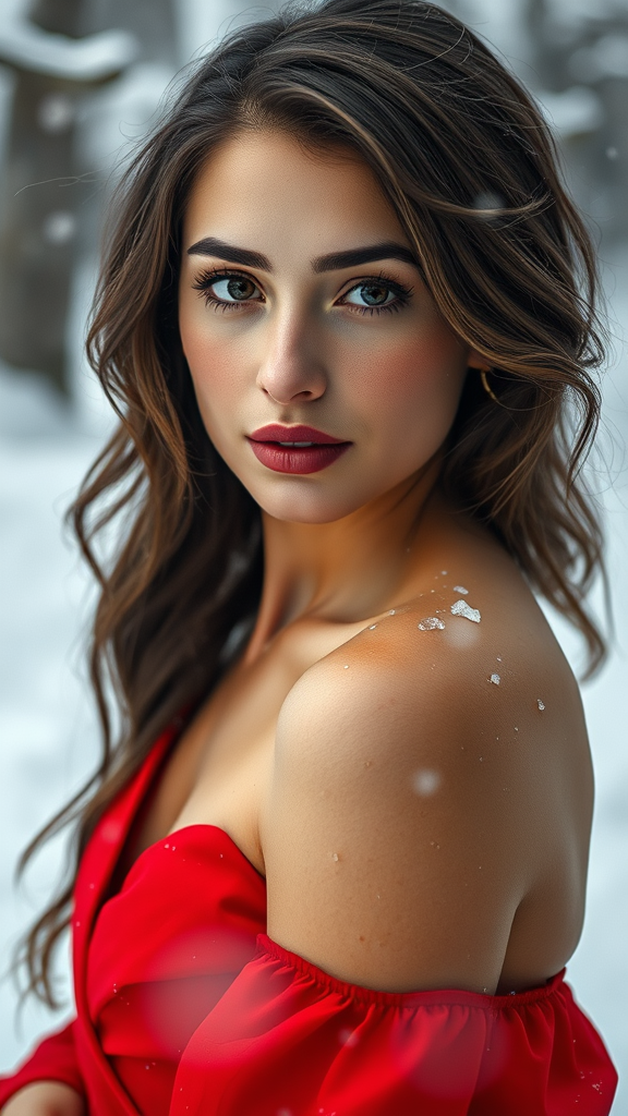 captivating image of a woman in a striking red dress set against a snowy winter background, gazing directly at the viewer, capturing an intimate portrait in the style of high-resolution photography, with detailed and lifelike skin texture. The composition is framed to highlight her full length, showcasing hyperrealism with rich color depth and textures that pop in 8k clarity. The lighting is gently diffused, creating a soft focus that complements the sharpness of the portrait, evoking a cinematic atmosphere. Every detail is meticulously crafted, bringing a sense of realism and depth, while maintaining artistic integrity without errors or distortions such as poor anatomy, missing or extra limbs, or image quality issues like JPEG artifacts or blurriness. The focus remains solely on the subject, ensuring no distractions from compositional flaws or additional elements like watermarks or text.