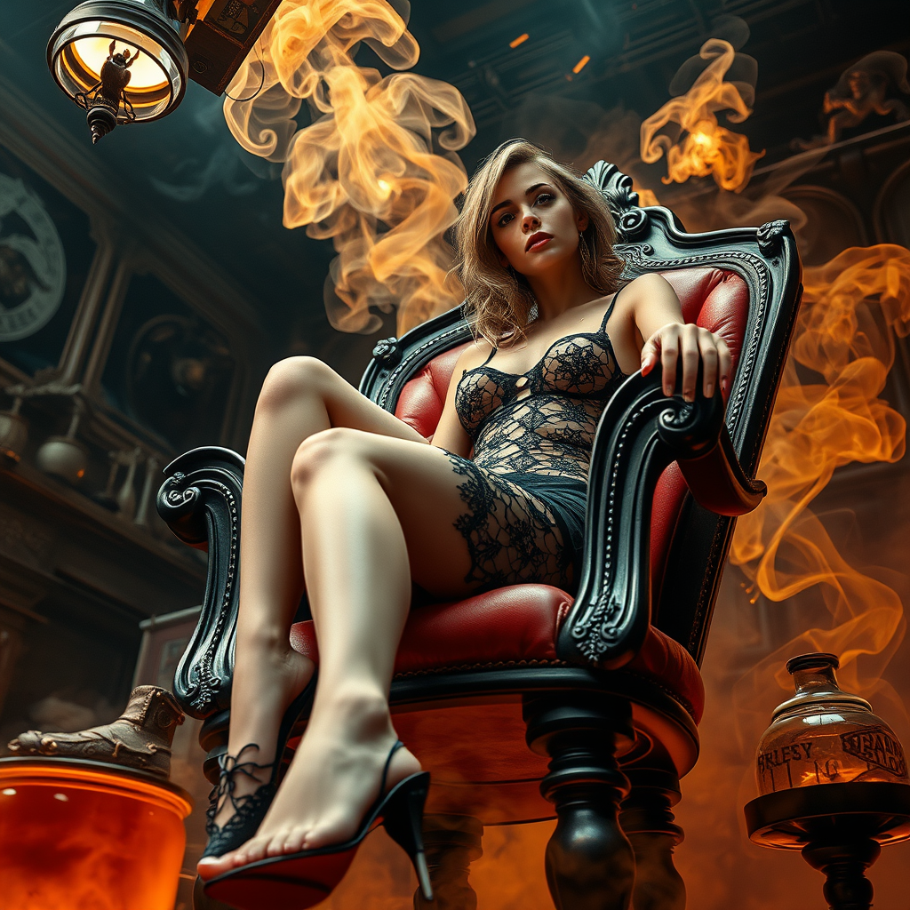 Captivating low angle action pose: a mesmerizing real alchemist girl adorned in intricate black lace resembling spider webs, surrounded by mystical alchemical creatures, confidently reclines on a luxurious high chair in her sophisticated laboratory as though posed for a portrait. The scene is breath-taking and richly detailed, with extraordinary lighting that casts swirling amber smoke. She wears enticing nightwear designed to accentuate her stunning beauty and hourglass figure, presenting an alluring pose under a richly lit, enigmatic atmosphere. Her attire, sheer and provocative, reveals her formidable presence in a full body, daringly scandalous posture. Concept art inspired by Ruan JIA, Ilya Kuvshinov, Antonio J. Manzanedo, Alphonce Mucha, and Ross Draws, features exquisitely color-coded, surreal rendering.