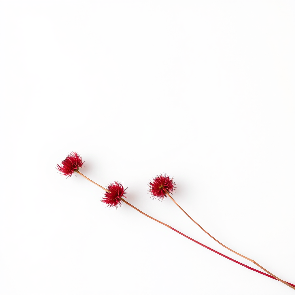 Captivating minimalistic image of crimson spikelets elegantly arranged against a pristine white backdrop, showcasing delicate contrasts and harmonious simplicity.
