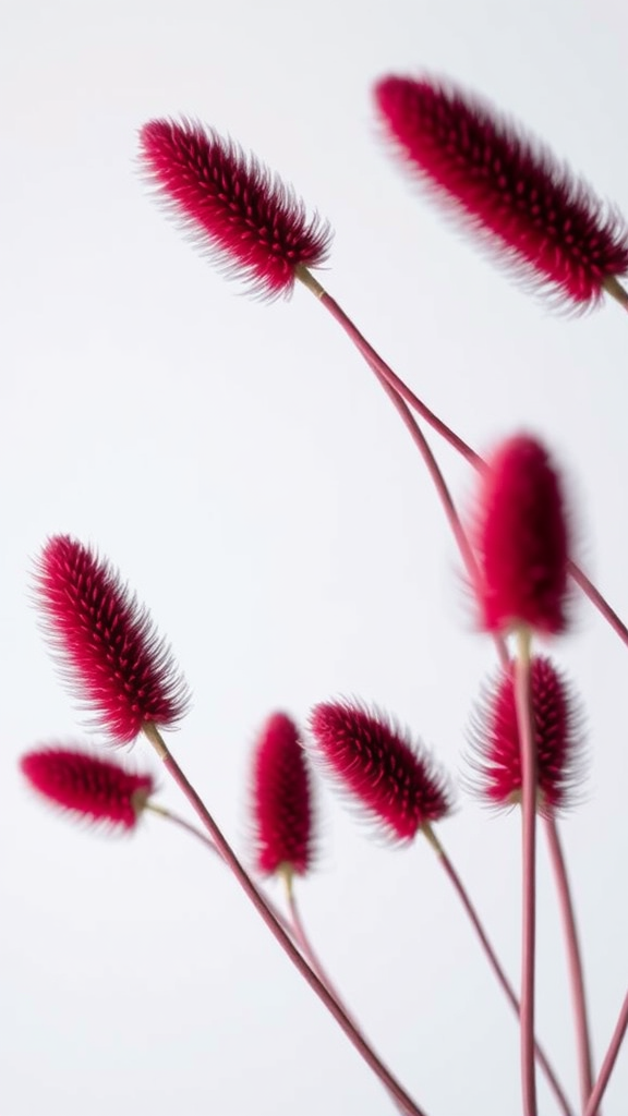 Captivating minimalistic photograph depicting crimson spikelets elegantly contrasted against a pristine white backdrop, with subtle creative nuances enhancing the visual harmony.