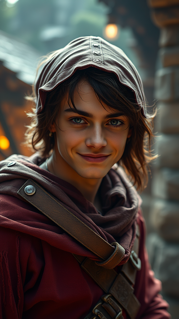 Captivating modelshoot of a charming medieval male halfling, radiating charisma and embodying the essence of a skilled thief in a fantasy ambiance, featuring intricate medieval details. The scene is inspired by RPG settings, enhanced by cinematic lighting, focusing on one charismatic character. Ultra-quality 8k resolution presents a friendly face, striking eyes, and an inviting demeanor, creating an ideal wallpaper. The composition avoids any visual flaws like duplicated or malformed features, capturing the essence of a classic fantasy rogue.