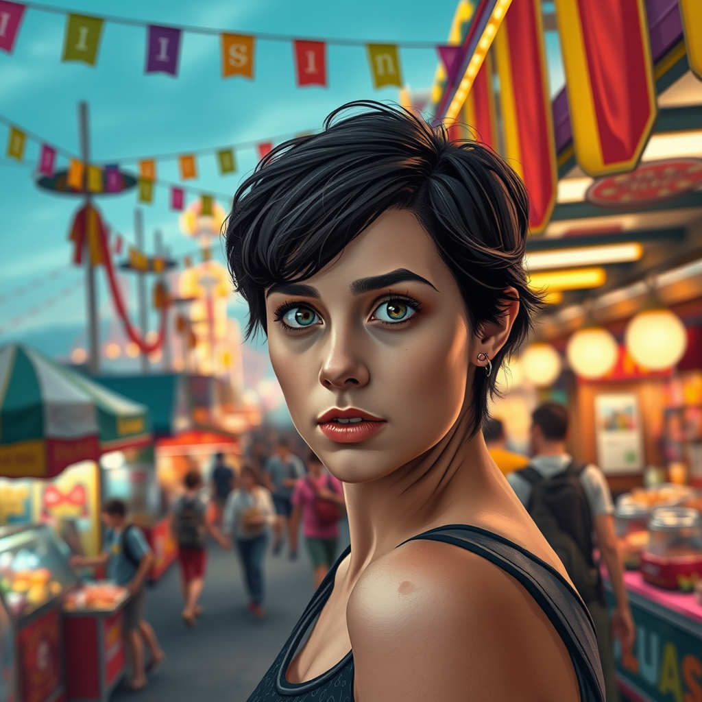 Captivating photo of Daisy Ridley at a bustling amusement park, her short dark hair framing her face as she glances at the camera. Surrounding her, merchant stalls overflow with food and souvenirs, while vibrant, colorful banners stretch across wide walkways. The scene boasts a sharp focus, embodying award-winning portrait photography with dramatic lighting, drawing influence from wlop, Jeffrey Simpson, Antonio J. Manzanedo, and Greg Rutkowski. Her expression is thoughtful, capturing an intriguing mix of emotion. The composition is a masterful blend of illustration and painting, maintaining depth of field and artistic shading. The artwork is stylized and colored, offering a contemporary twist on classical portraiture.