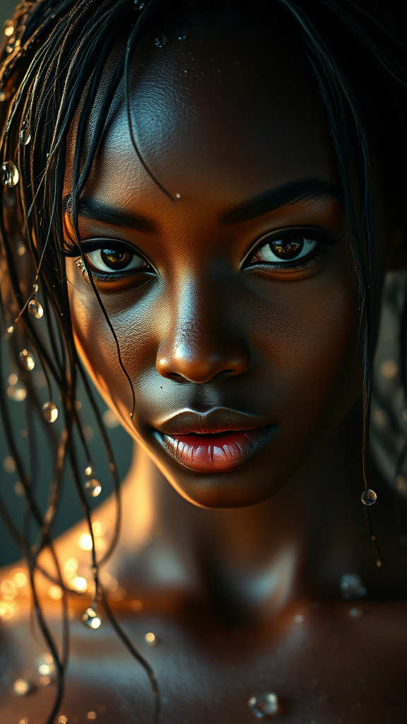 captivating photograph of a stunning young black woman with glistening water droplets on her radiant skin and wet hair, her eyes holding an otherworldly allure, captured in ultra-high resolution with a cinematic perspective, enhanced by dynamic backlighting that casts a magical glow