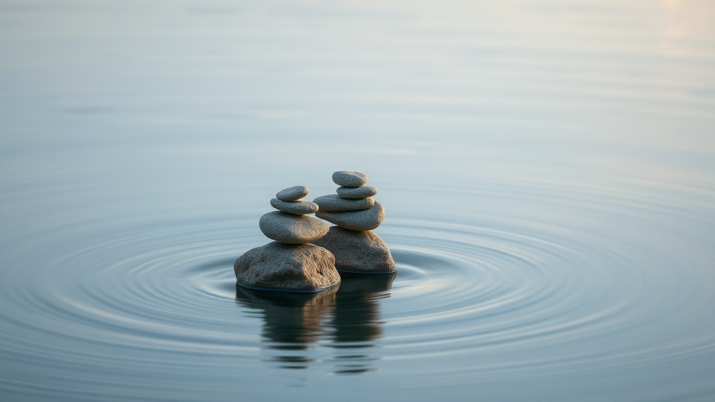 Captivating photograph of delicately balanced stones emerging from a tranquil water surface, exuding minimalism with a serene atmosphere, captured in extended exposure to highlight subtle movement, characterized by soft, muted tones using an 85mm lens, aspect ratio 3:4, with a gentle play of light and shadow enhancing the composition.