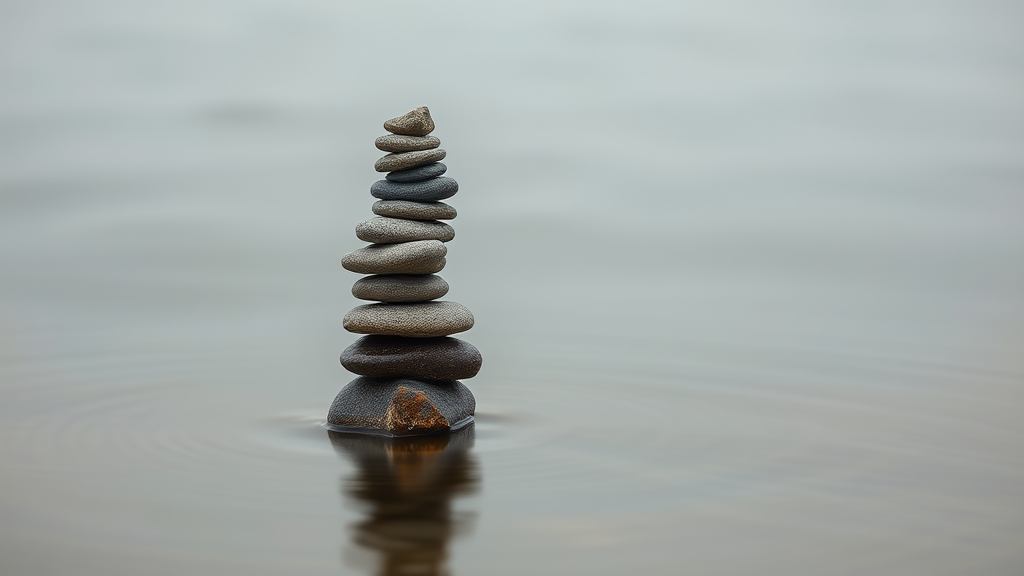 Captivating photograph of intricately stacked stones on a serene water surface, minimalist composition, extended exposure time, subtle tones, captured with an 85mm lens, aspect ratio 3:4, version 5.