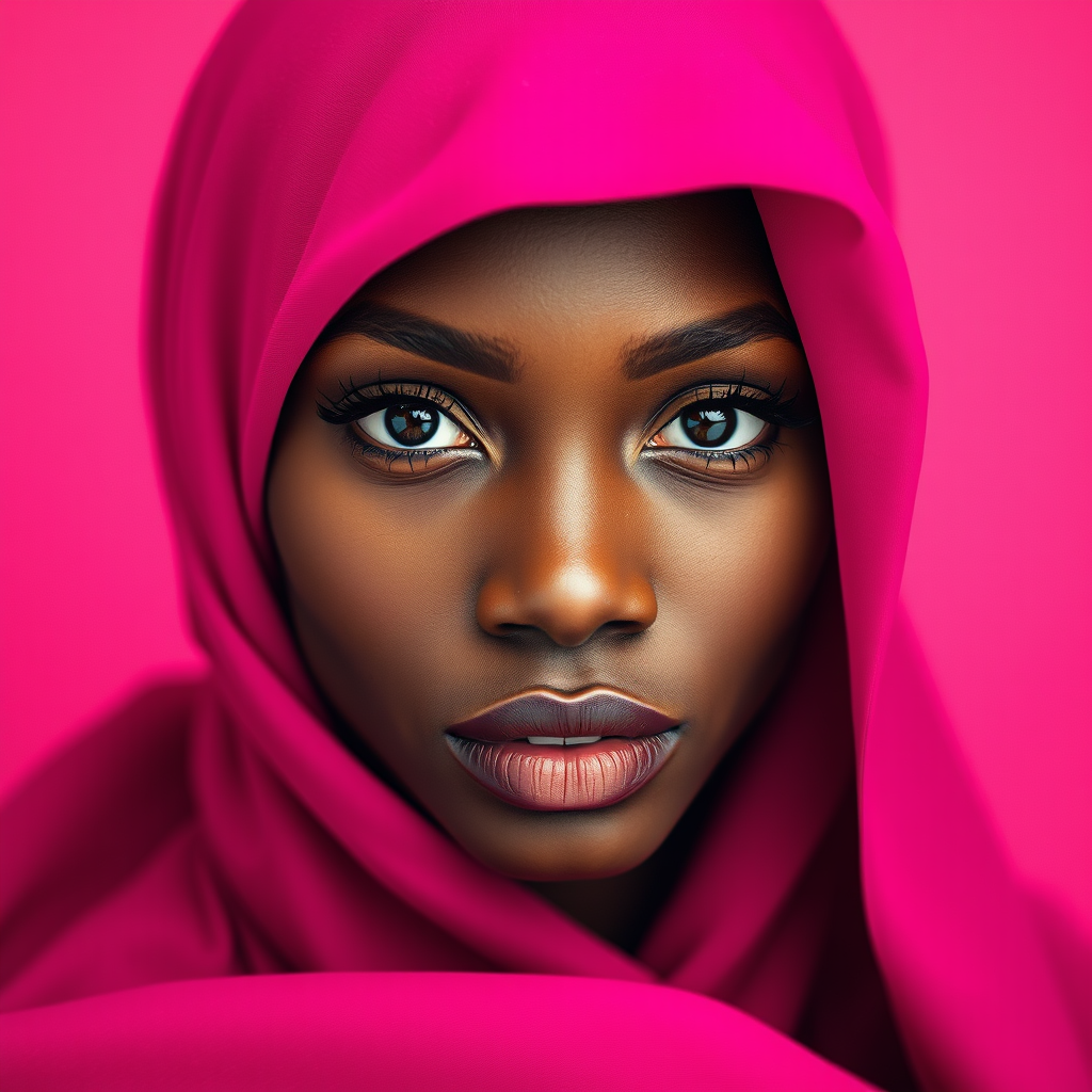 Captivating portrait of a black woman model enveloped in a vibrant hot pink hue, posed against a seamless solid pink backdrop. Her eyes feature intricate and stylish detailing, reflecting a soulful allure. Photographed using a camera setup mimicking a large aperture, f/1.4, capturing the subject in stunning focus while softly blurring the background. The composition maintains a raw and authentic style, embracing the elegance and power of the model in a 9:16 aspect ratio.