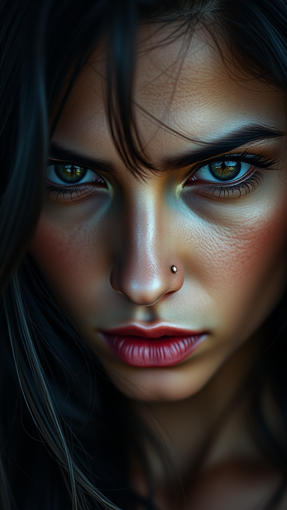 Captivating portrait of a dark-haired woman with an intense gaze directed at the viewer, showcasing her detailed and realistic skin texture. Captured in a full-length frame, the image is rendered in stunning 8k resolution with high detail. The photo features vibrant RAW colors, and the artistry highlights her piercing beautifully. The scene is bathed in diffused soft lighting with a shallow depth of field, ensuring sharp focus on her striking features. The style leans into hyperrealism, enhanced by cinematic lighting that underscores the mood of the composition.