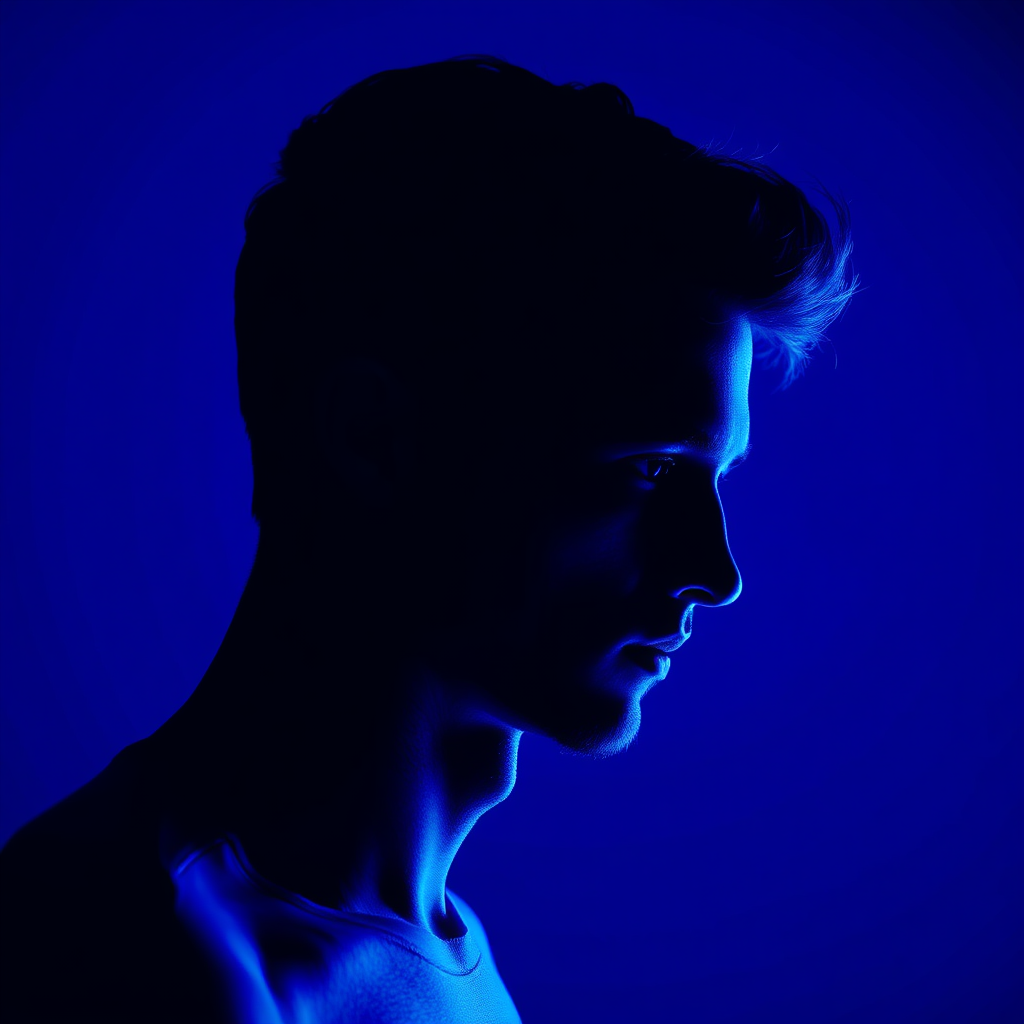 Captivating portrait of a man's profile silhouette set against a vibrant deep blue background, where blue lighting enhances the contours of the face and hair, creating a mesmerizing dance of light and shadow akin to a color field painting. The subject is depicted in a rich blue hue that vividly contrasts with the monochrome backdrop. The camera setup emulates a large aperture, such as f/1.4, to produce a shallow depth of field, maintaining sharp focus on the silhouette's edge. The image is photorealistic in ultra-high definition, capturing the essence with raw style and a stylized elegance, complete with creative nuances that remain true to the original vision of bold simplicity.