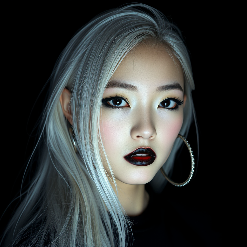 Captivating portrait of a stunning young goth girl with dark lipstick and dramatic black eyeliner, her silver-white hair cascading down, adorned with large shimmering silver hoop earrings. The image captures a sense of mystery and allure, set against a rich black backdrop with a subtle film grain texture. Photographed with a high-quality Nikon D850, the subject is a strikingly beautiful Chinese woman, her enigmatic gaze adding depth to the moody studio shoot.