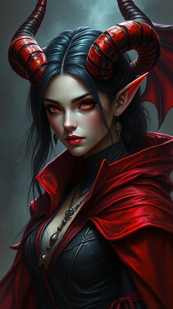 Captivating portrait of a tiefling warlock, a woman adorned with elegant horns and a flowing crimson cape, exuding otherworldly charm, intricate digital illustration capturing the essence of a demon girl in dark fantasy style, inspired by the works of Alena Aenami and Artgerm, combined with the atmospheric flair of Mohrbacher and Guillem H. Pongiluppi, her striking features and mysterious aura illuminated by an ethereal glow, a stunning DnD-inspired character painting that entrances with its depth and detail.