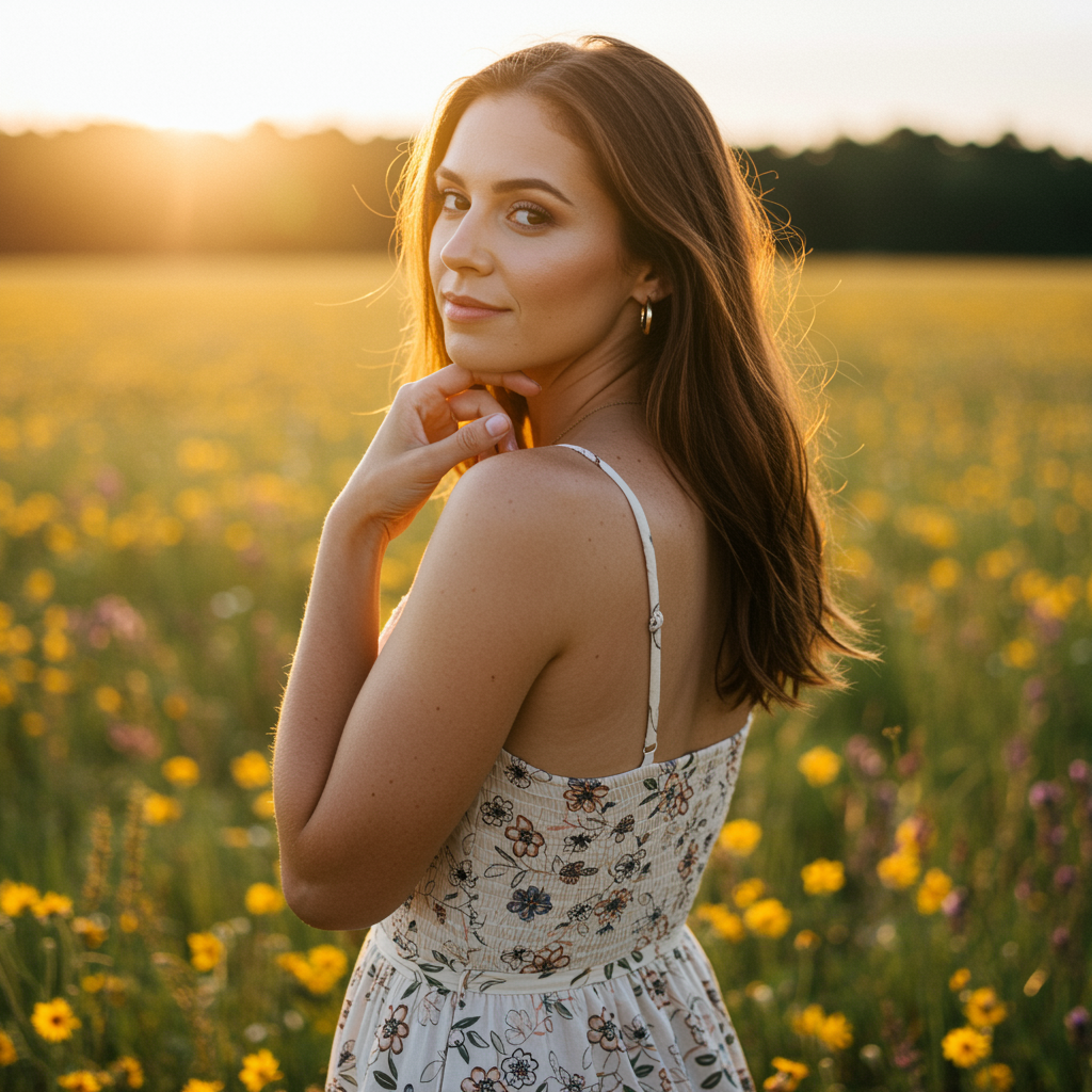 Captivating portrait of a woman standing amidst a field of wildflowers, the golden sunlight casting a warm glow on her serene expression as her hair gently sways in the breeze, capturing the essence of natural beauty and tranquility.