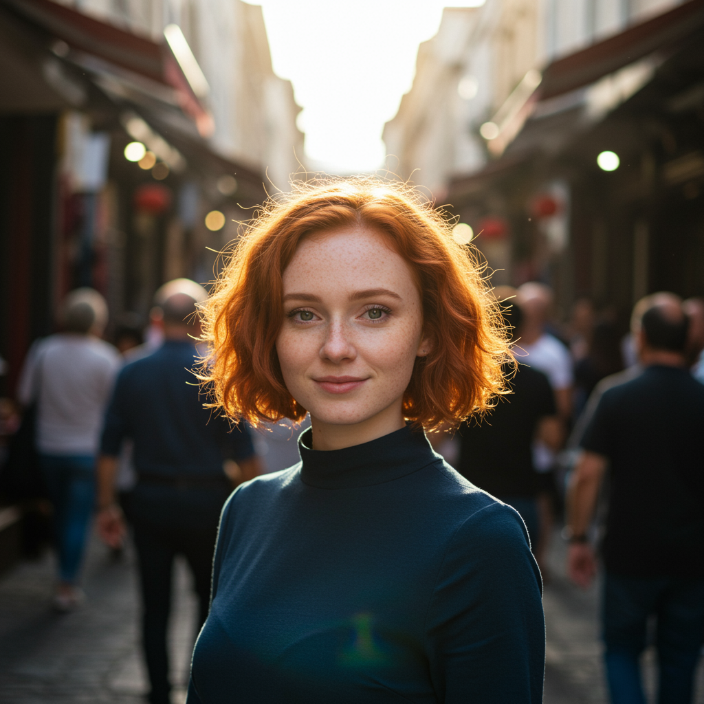 Captivating portrait of a young red-haired woman with short, wavy locks, exuding charm as she stands alone amidst the vibrant bustle of a busy marketplace.