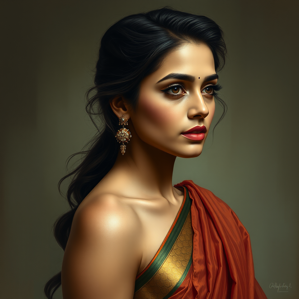 Captivating portrait of Deepika Padukone in a sari, side profile, exquisite highly detailed face, inspired by Rembrandt, realistic yet dreamlike, sophisticated aesthetic sensibility, graceful femininity, raw authenticity, hyper-realistic, expressive facial qualities, precise and intricate, flowing, light caramel tones, delicate charm.