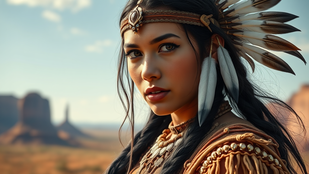 Captivating portrait photograph of a young beautiful Native American woman inspired by Madison Beer as Pocahontas, showcasing perfect symmetrical features and adorned with intricate feather jewelry. She's clad in a traditional handmade dress, embodying the spirit of an armed female hunter warrior. Set against the stunning backdrop of a Utah landscape, the scene is ultra-realistic with the elegance of concept art. The composition includes a delicate depth of field, captured in vivid 8k detail, reminiscent of artworks by Artgerm, Greg Rutkowski, and echoing the style of Alphonse Mucha.