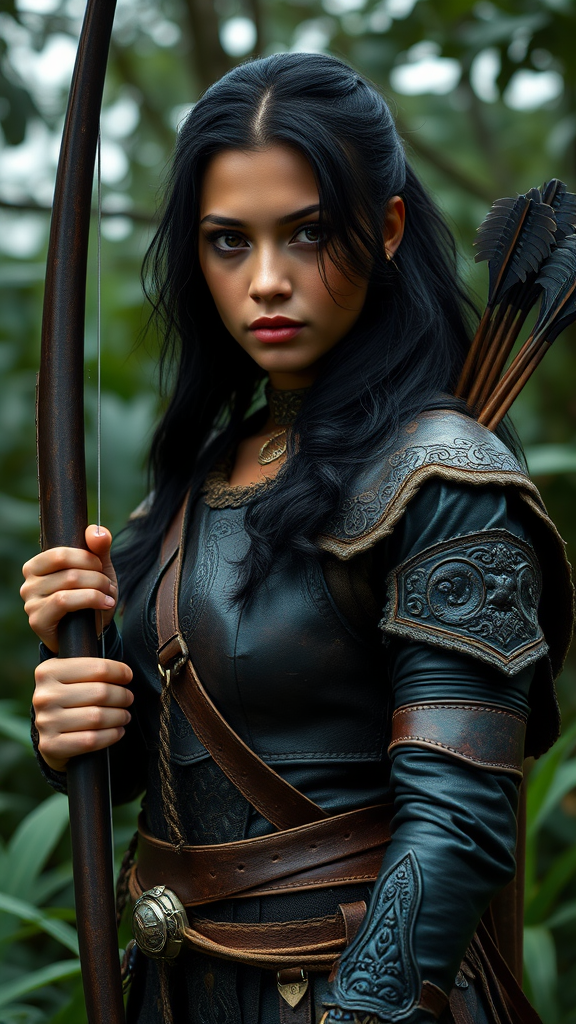 Captivating rainforest warrior with a sleek bow and polished arrows in a lush forest setting; cascading black hair; fair, radiant complexion; mesmerizing hazel eyes; perfectly balanced and ethereal facial features; engaging the viewer with a confident gaze; harmonious facial proportions, body, limbs, and fingers; wearing exquisitely crafted leather armor adorned with intricate patterns; waist-length portrait shot showcasing detailed craftsmanship; incredibly high-definition detail; ultra-realistic presence with dramatic lighting; soft overcast skies; expert use of reflection and shadow; photorealistic and movie-grade visual quality; cinematic focus and depth; visual effects enhanced with ray-traced lighting for a lifelike experience; 8k resolution with a sophisticated filmic grain that adds authenticity.