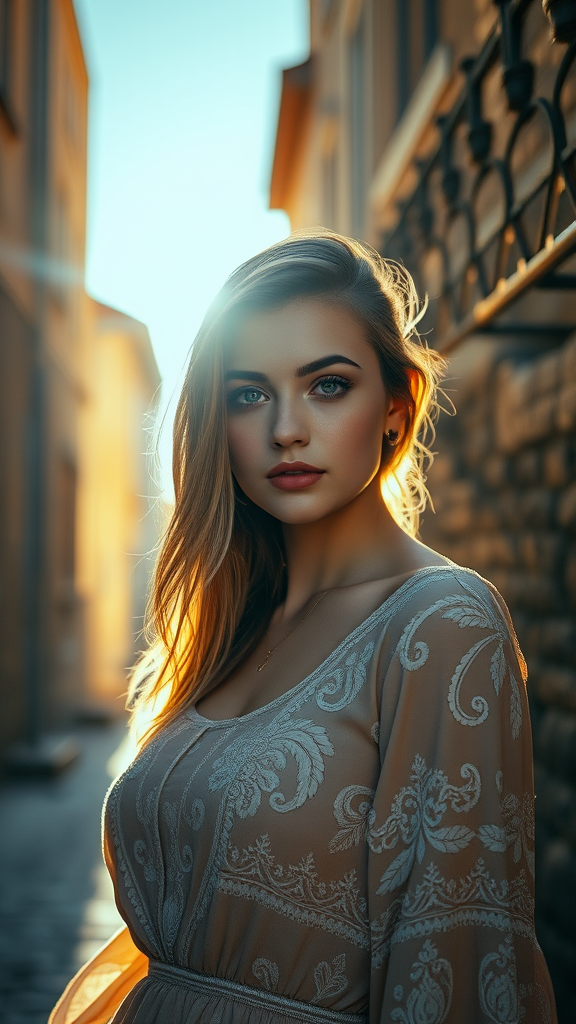 Captivating spontaneous shot of a young Russian woman, 24 years old, standing in an alley during sunset, illuminated by radiant light rays, high-resolution image, showcasing detailed facial features with sharp focus, aesthetic composition, extremely detailed eyes, body, and skin, featuring intricately detailed clothing, realistic with maximum detail, natural skin texture and realistic shadows enhance the photorealism, ultra-realistic photography at 8k UHD, HDR, elegant and sophisticated, captured with a cinematic touch using a Sony Alpha 1 and 85mm lens at f/1.4 GM, offering a smooth and sharp focus, center framed and symmetrical, akin to a still from a fashion model photoshoot, devoid of any distortions, imperfections, or digital artifacts.