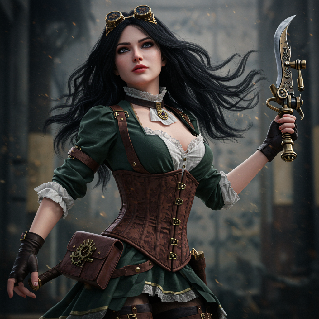 View this AI-generated image featuring captivating steampunk woman with flowing black hair adorned in intricate steampunk attire and armed with a uniquely designed weapon highly detailed hyperrealistic style captured in stunning 8k resolution with a cinematic touch employing a 9 16 aspect ratio conv