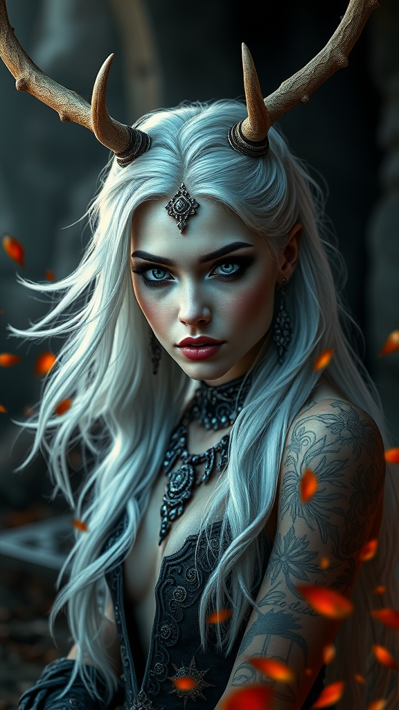 Captivating woman, ethereal beauty, breathtaking, enigmatic, divine presence, adorned with elegant deer antlers, radiant aura, snow-white hair, alabaster skin, intense and passionate, fierce, mythical demoness, intricate tattoos, elaborate ornaments, exquisite jewelry, high-resolution detail, luminous glow, enchanting gaze, detailed and lifelike eyes, dramatic shot, embers alight, drifting autumn leaves, post-apocalyptic ambiance, artistic rendering, complex imagery, photographic realism, striking model, volumetric lighting, mystical allure, dynamic game character, lifelike and immersive, awe-inspiring setting, ancient ruins, inspired by Sophie Anderson, Artgerm influence, striking portrait, captivating avatar, contrasting elements.