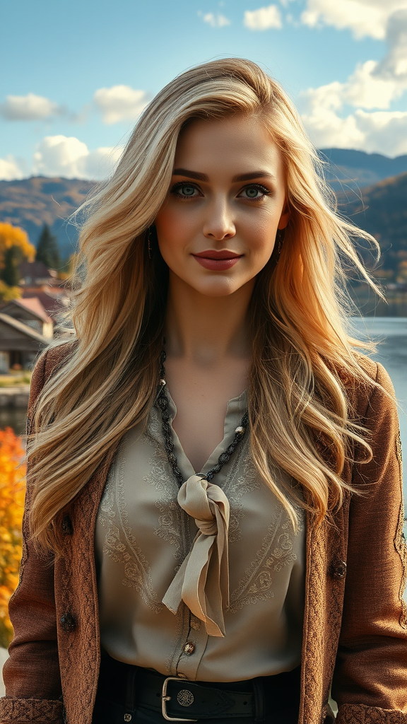 Captivating woman with flowing blonde hair gazes warmly at the viewer, adorned in an elegant blouse and jacket with intricate details. Beyond, a picturesque scene unfolds with a charming row of houses lining the serene shoreline of a tranquil lake. The landscape is ablaze with the vibrant colors of autumn, painting a stunning tapestry. The composition is award-winning, professional, and highly detailed, capturing a sense of beauty and peace.