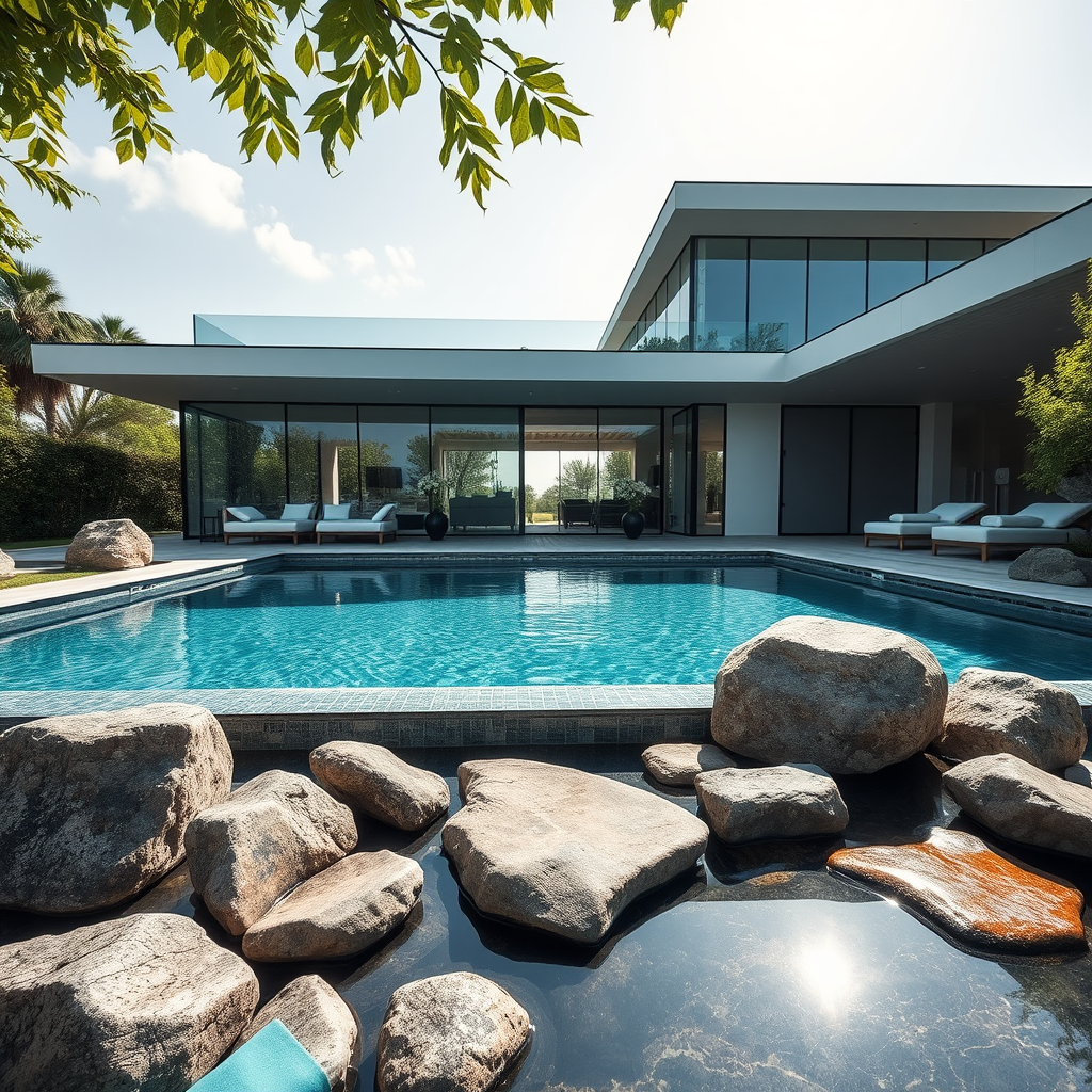 Capture a breathtaking architecture design photograph, showcasing a luxury house that seamlessly blends modern and classic elements. The image should feature a sparkling pool surrounded by elegant landscaping, including artistic arrangements of natural rocks, all set against a backdrop of lush greenery to enhance the luxurious feel. The house should boast sleek lines and sophisticated charm, with large glass windows reflecting the serene environment. Bright sunlight plays across the scene, highlighting the contrasting textures and materials used in the architecture for a truly captivating and high-resolution visual experience.