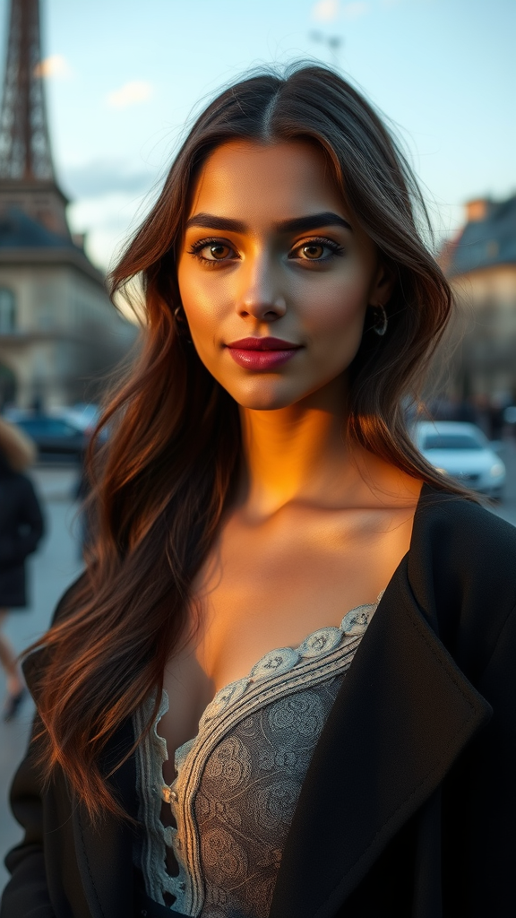 Capture a breathtaking candid shot of a charming young woman in Paris at sunset, with radiant light casting a beautiful glow. Emphasize high resolution with sharp focus, highlighting detailed facial features, eyes, and skin. Her attire should be intricately detailed, showcasing a blend of elegance and realism. Use realistic shadows and natural skin texture to enhance the photorealistic quality. Incorporate cinematic elements and a shallow depth of field to give the photo an elegant, high-definition look. Focus on symmetrical composition, hinting at a fashion model allure. Keep the scene clear of any distortions or errors, ensuring the depiction is natural and lifelike.