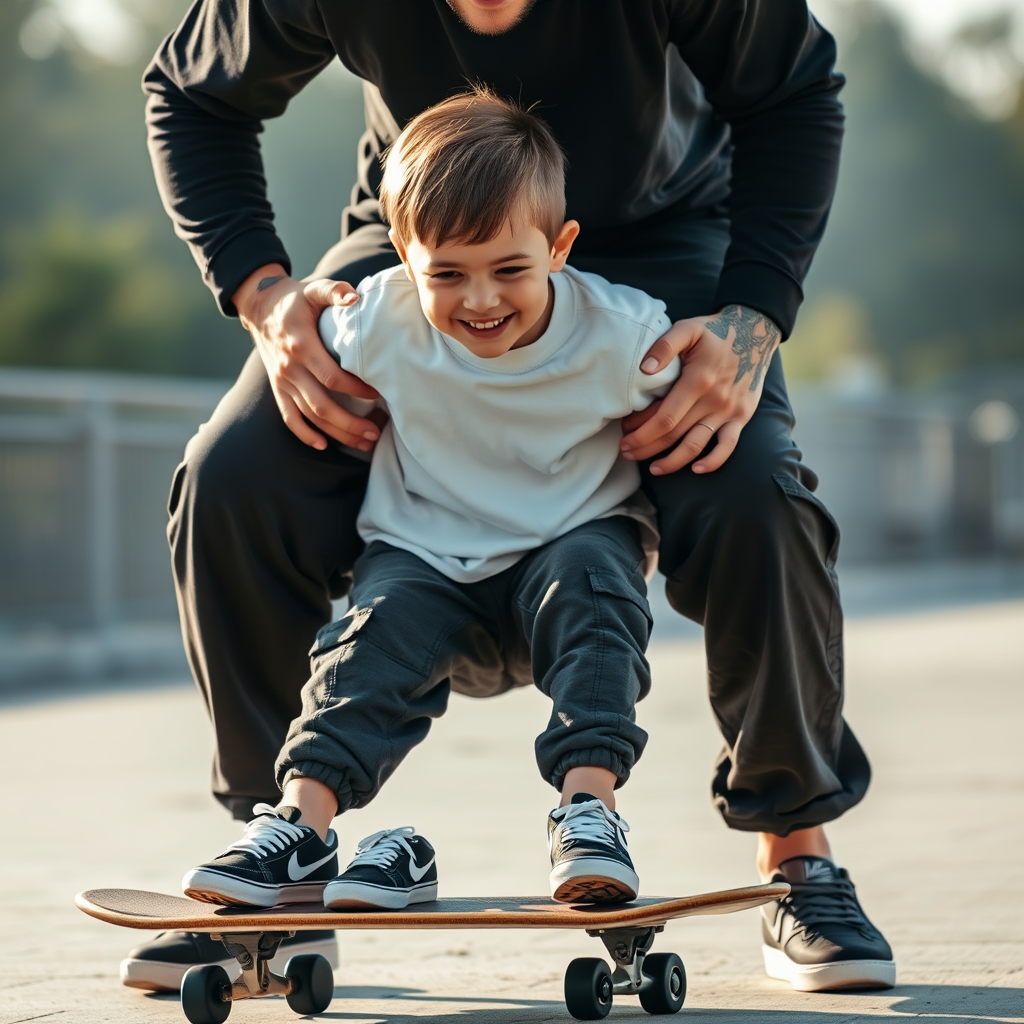 Capture a candid photograph of a boy and his dad, both radiating joy, as they share a special moment on a skateboard. The boy, full of playful energy and cool confidence, sports a crisp white loose-fit T-shirt paired with dark grey cargo joggers. His dad supports him with strong, tattooed hands, clad in black loose-fit long sleeves. Both wear contrasting Nike SB skateboard shoes, one pair new and the other comfortably worn, highlighting their unique styles. The scene is bathed in soft, natural light that enhances their perfect face-to-body ratio. This tender moment reflects the balance and shared joy between generations. Shot with a Sony α9 II using the Sony FE 100-400mm f/4.5-5.6 GM OSS lens, the image captures a high-contrast effect in UHD, adding depth to the serene setting.